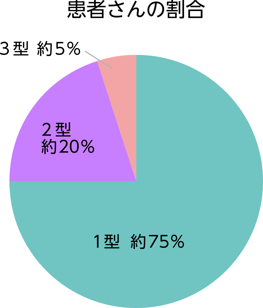 患者数は1型が最も多く、フォン・ヴィレブランド病患者さんの約75%を占めます。