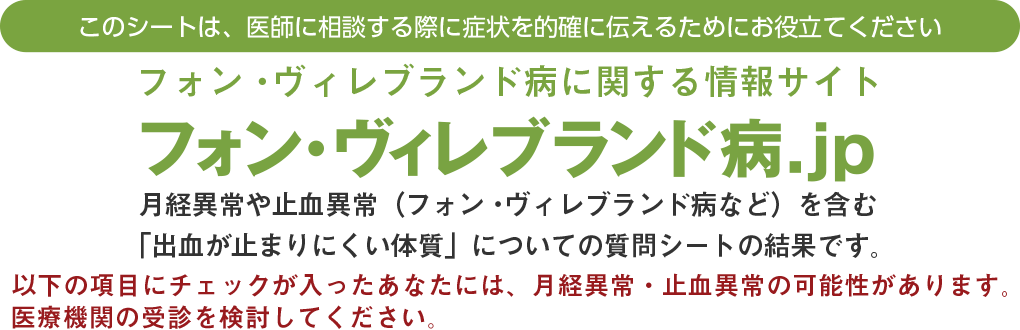 これより先は、「フォン・ヴィレブランド病(VWD・血液凝固異常症)の診断・治療を行える病院を探すための特設サイト」(当社が業務委託している株式会社QLifeのサイト)となります。
