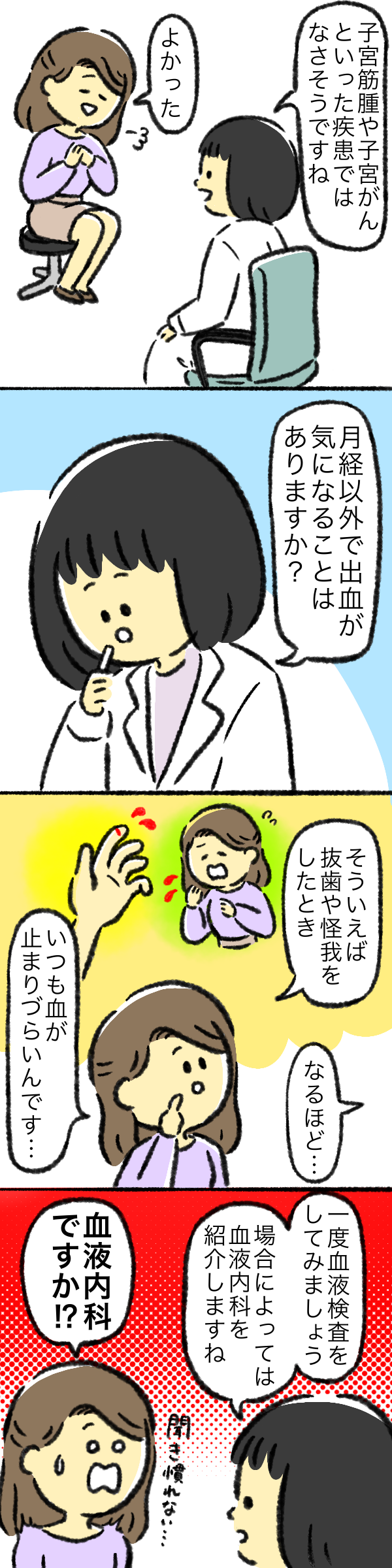 過多月経の原因の一つとして、血液凝固(止血)の異常が関与している可能性があるので、血液内科の受診をすすめられることがあります。