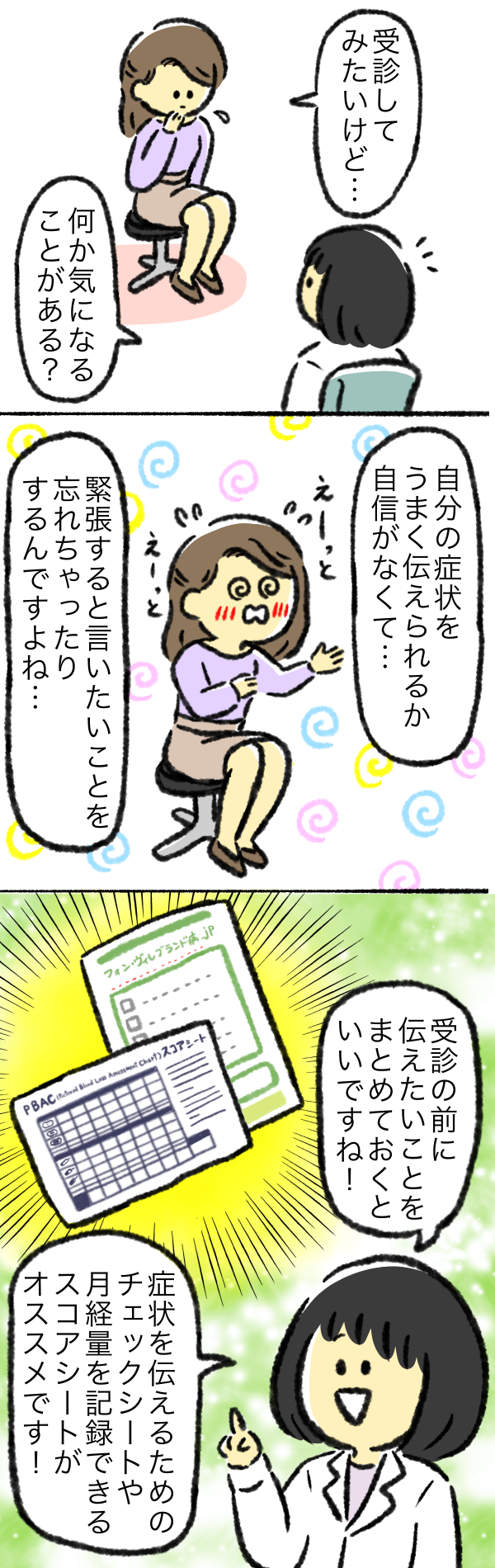 - 産婦人科や血液内科を受診する際には、事前に気になっている症状をまとめておくと、スムーズに医師に伝えられると思います。